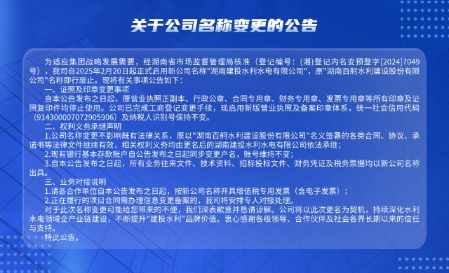 2022年9月,原湖南建工集團與原湖南交水建集團合并組建湖南建設投資集團。原雙方集團旗下的湖南百舸水利建設股份有限公司和湖南建工集團水利水電工程公司合并為湖南建投百舸水利公司,實行兩塊牌子(百舸水利、建工水利)管理,為湖南建投集團唯一水利建設企業。2024年9月,公司正式更名為湖南建投水利水電有限公司(簡稱湖南建投水利),統籌管理“百舸水利”“建工水利”“施工公司”“疏浚公司”等子品牌。